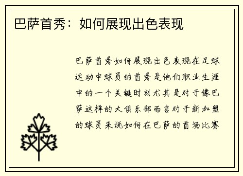 通过对巴萨首秀如何展现出色表现的全面分析,我们可以看到,球员的心态准备、赛前的训练准备、比赛中的技术发挥以及赛后的总结提升,都是决定首秀表现的关键因素。每一环节都相互关联,共同促进球员在赛场上的优异表现。